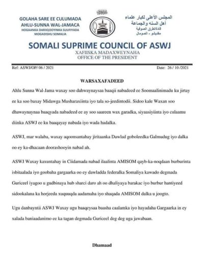 “ ASW Waxay kaxuntahay in Ciidamada nabad ilaalinta AMISOM qayb-ka-noqdaan burburinta isbitaalada iyo goobaha gargaarka oo ay dawladda federalka Somaliya kawado degmada Guriceel iyagoo u gudbinaya hub shurci daro ah oo dhaliyaya barakac iyo burbur hantiyeed sidookalana ka horjeeda xuquuqda aadamaha iyo shaqada AMISOM dalka u joogto ayaa lagu yiri” Qoraalka hoggaanka Ahlusunna.