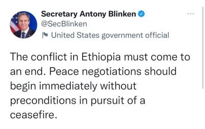 Wasiirka Arrimaha dibedda ee dalka Mareykanka Antony Blinken: “Qalalaasaha ka jira Ethiopia waa in la joojiyaa. Wadahadal nabadeed waa in degdeg ay u billowdaan shuruud la’aan si loo helo xabad joojin”.