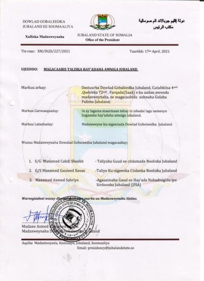 Madaxweynaha Dowlada Goboleedka Jubaland Mudane Ahmed Mohamed Islaam ayaa isbadal ku sameeyay Taliyayaasha kala duwan ee Hay’adaha amniga Jubaland.