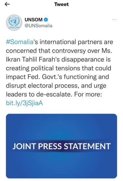 Waxaan sii wadaynaa xiriirka aan la yeelano madax Soomaaliyeed oo badan si aan ugu boorinno in si degdeg ah loo xalliyo khilaafkan, oo ay ku jirto baaritaan lagu kalsoonaan karo oo ku saabsan waayitaanka Ikraan iyo dhammaystirka geeddi socodka doorashada iyada oo aan dib u dhac kale dhicin.