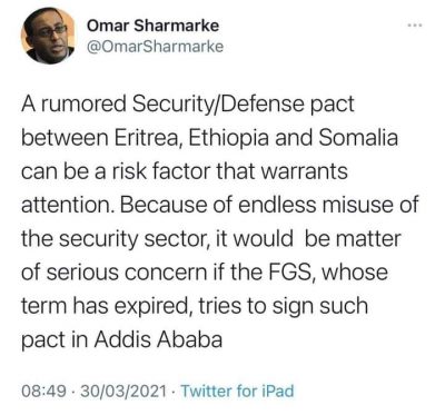 Ra’iisul Wasaarihii hore ee Soomaaliya Cumar C/rashiid oo qoral kooban soo dhigay bartiisa Twtterka ayaa ka digay isku dayga heshiis amni iyo difaac oo u dhaxeeya Eritrea, Itoobiya iyo Soomaaliya, kaasoo uu ku tilmaamay inay tahay arrin khatar keeni karta oo u baahan fiiro gaar ah.