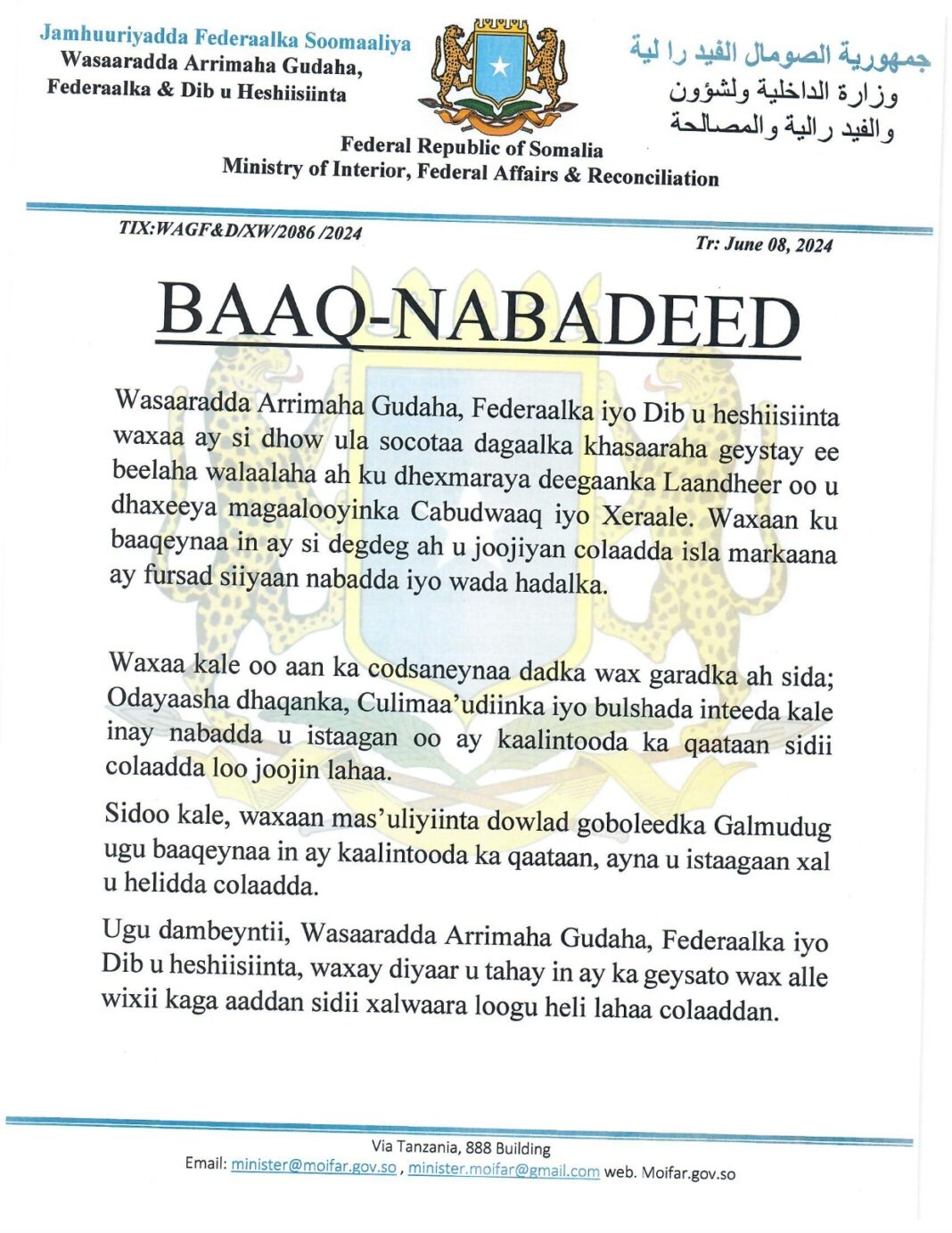 Wasaaradda arrimaha gudaha, federaalka iyo dib u heshiisiinta XFS ayaa baaq nabadeed kasoo saartay dagaal beelo walaalo ah ku dhex-maraya inta u dhaxeysa degmooyinka Xeraale iyo Caabudwaaq ee gobolka Galgaduud.