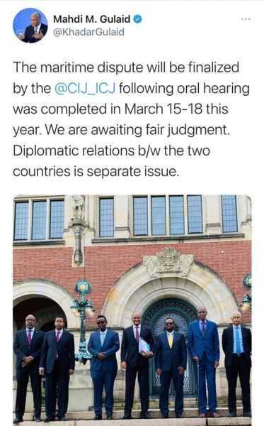 “Muranka Badda waxaa dhameystiri doona ICJ kadib markii dhageysigii hadalka ahaa lasoo geba gebeeyeey March 15-18 ee sanadkan. Waxaan sugeynaa go’aan caddaalad ah. Xiriirka diblomaasiyadeed ee labada dalna waa arrin gaar ah,” ayuu yiri Mahdi oo qoraal soo dhigay bartiisa twitterka.