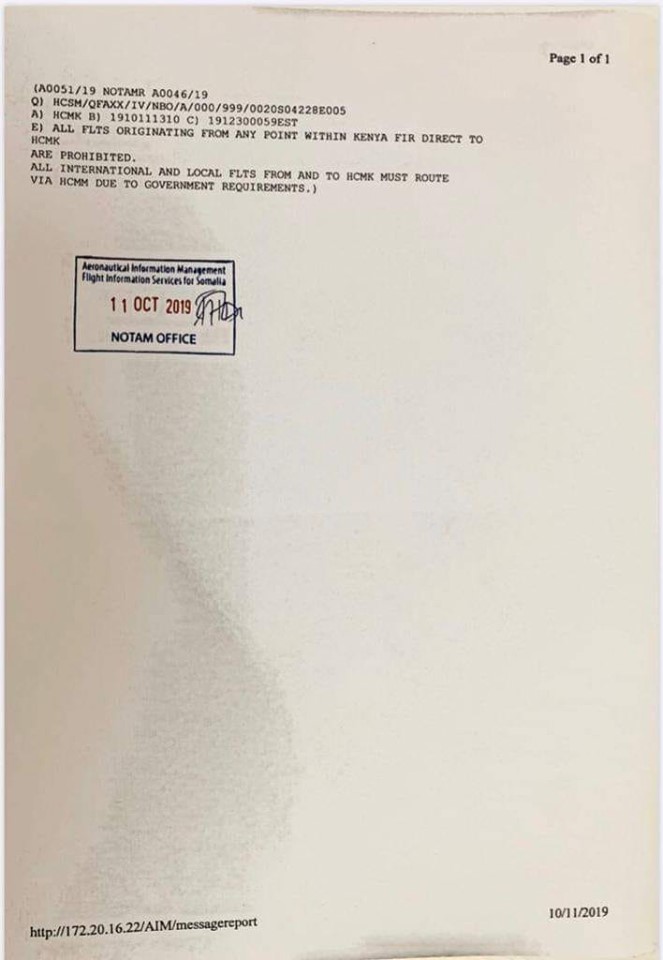 Sidoo kale waxaa qoraalka ay iskula hadlaan duulimaadyada lagu sheegay in diyaaradaha aadaya Kismaayo inay soo maraan Muqdisho, taasoo ahaa go’aan horay u jiray oo mar kale dib loo cusbooneysiinayo, waxaana la ogeysiiyay amarkan dowladda Kenya