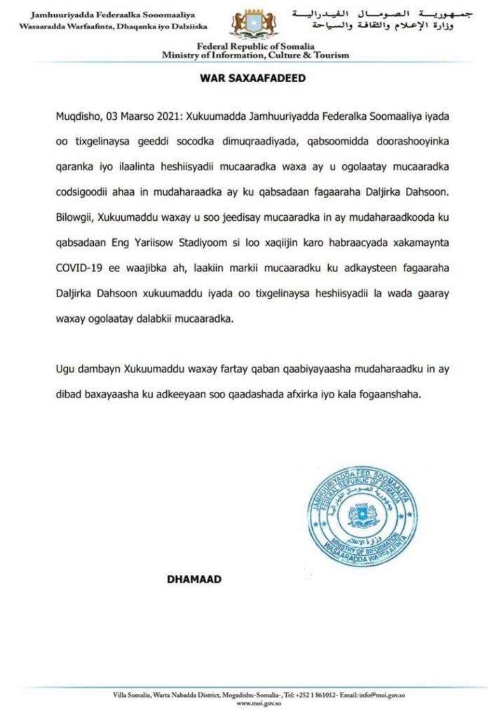 War-saxaafadeed ka soo baxay xukuumadda Soomaaliya ayaa lagu sheegay in dowladdu ay mucaaradka ka dalbatay in banaanbaxa u qorsheysan lagu qabto garoonka kubadda cagta ee Eng. Yariisow.