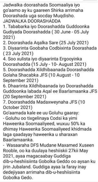 Mid ka mid ah jadwaladii doorasho ee ay soo saareen Golaha Wadatashiga Qaran ee aan dhaqan gelin waxay maanta oo ah 10 October ku beegneyd inay dhacdo doorashada Madaxweynaha, gaar ahaan jadwalkii soo baxay bishii June.