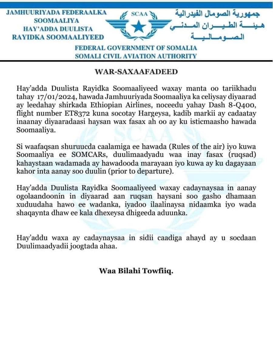 Dowlada Soomaaliya ayaa ka hadashay diyaarad Ethiopia leedahay oo laga celiyey hawada Soomaaliya.