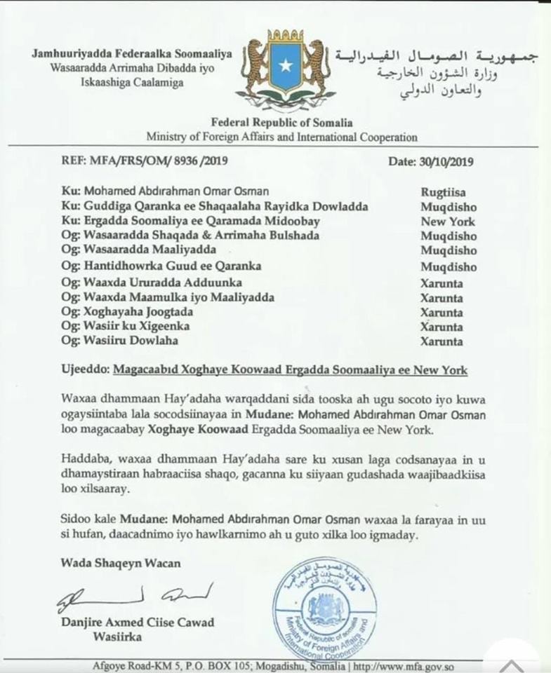 Wareegto kasoo baxday Xafiiska Wasiir Cawad ayaa waxaa Maxamed Cabdiraxmaan Cumar Cismaan Yariisow loogu Magacaabey xilka Xoghayaha Koowaad ee Ergada Soomaaliya ee Qaramada Midoobey.