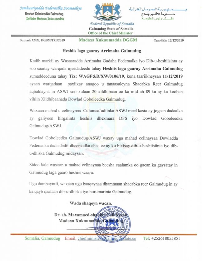 Dowladda iyo Ahlusunna oo ka heshiiyay dhismaha Galmudug (Akhriso)