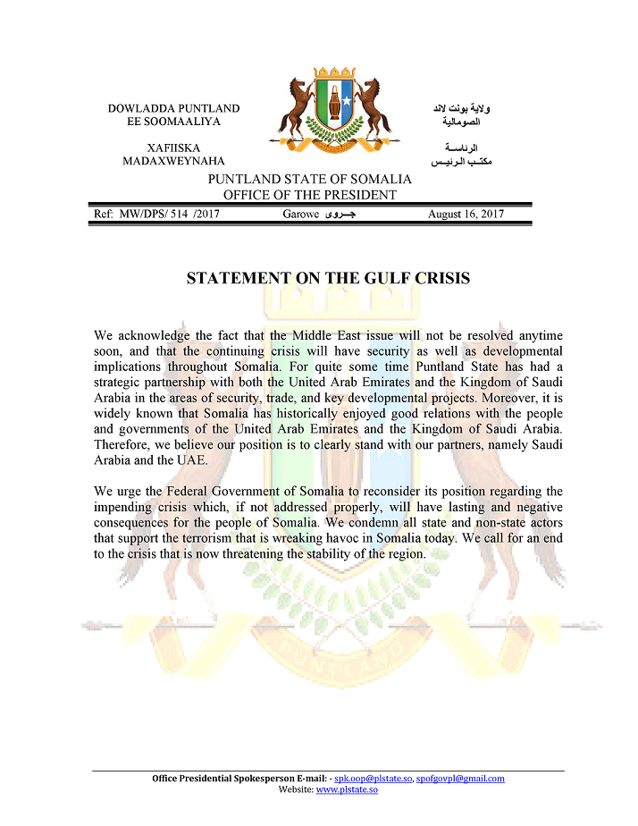 Dowladda Puntland ayaa maanta taxliilisay in ay si buuxda u garabtaagan tahay dowladaha Sacuudi Carabiya iyo Imaaraatka oo dhowaan xidhiidka u jaray dowladda Qatar, kaddib markii ay ku eedeeyeen in Qadar ay taageerto argagixisida caalamiga iyo tan Soomaaliya.