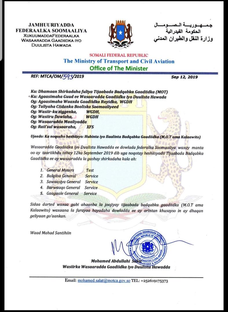 Wasaaradda Gaadiidka iyo Duulista Hawada ayaa ka laabatay Heshiis ay horay ula gashay illaa shan shirkadood, kuwaasoo heshiis lagula galay hubinta iyo illaalinta badqabka gaadiidka.