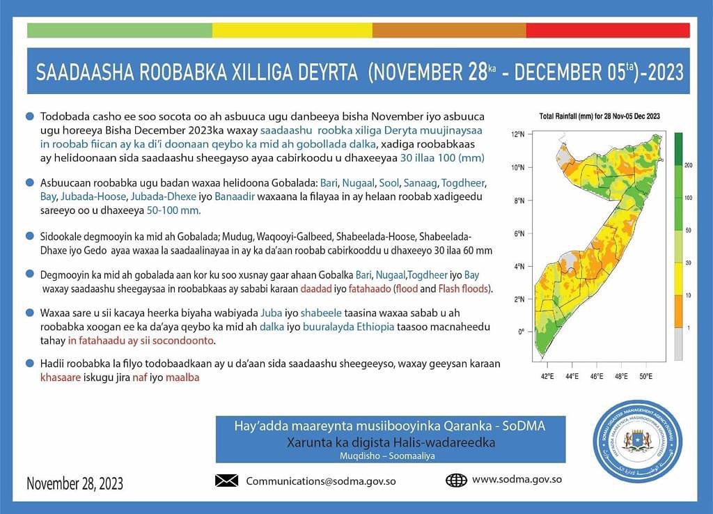 Hay’adda Maareynta Musiibooyinka Qaranka Soomaaliyed ee SODMA ayaa soo saartay digniino la xariira Roobab la filayo dhamaadka bishaan iyo bilowga bisha December ee Sanadkaan ka da’aan dalka Soomaaliya.