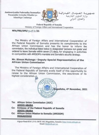Qoraal ka soo baxay Wasaaradda Arrimaha Dibadda Soomaaliya ayaa lagu eedeeyay in Mr Mulongo uu ku gudajiray howlo aan waafaqsaneyn waajibaadka AMISOM iyo Istiraatiijiyadda Amniga.