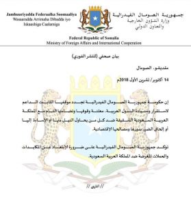 War qoraal ah oo ku qornaa luuqada Carabiga kana soo baxay maanta Madaxtooyada Soomalaiya, ayaa waxaa lagu taageeray dowladda Sacuudiga oo ay Beesha caalamku ay ku tuhmayso in ay ku luglahayd dilkii wariye Jamaal Kashogg oo ka dhacay gudaha Qunsuliyada Sacuudiga ee uu ku leeyahay dalka Turkiga .