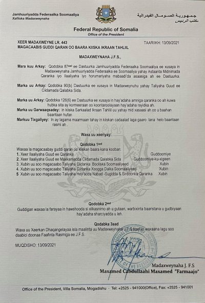 Qoraal goordhow kasoo baxay Madaxtooyadda Soomaaliya ayaa waxaa lagu sheegay in Madaxweynaha Jamhuuriyadda Federaalka Soomaaliya Maxamed Cabdullaahi Farmaajo oo mudnaan siinaya in baaritaan daah furan lagu sameeyo Kiiska Sarkaal Ikraan Tahliil Faarax uu u Magacaabay Guddi Qaran.