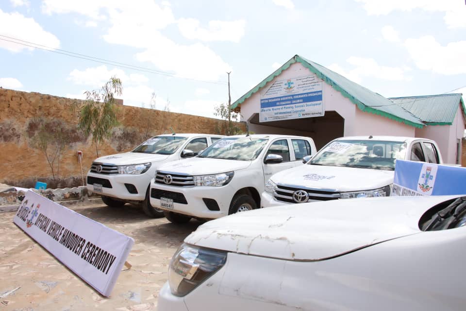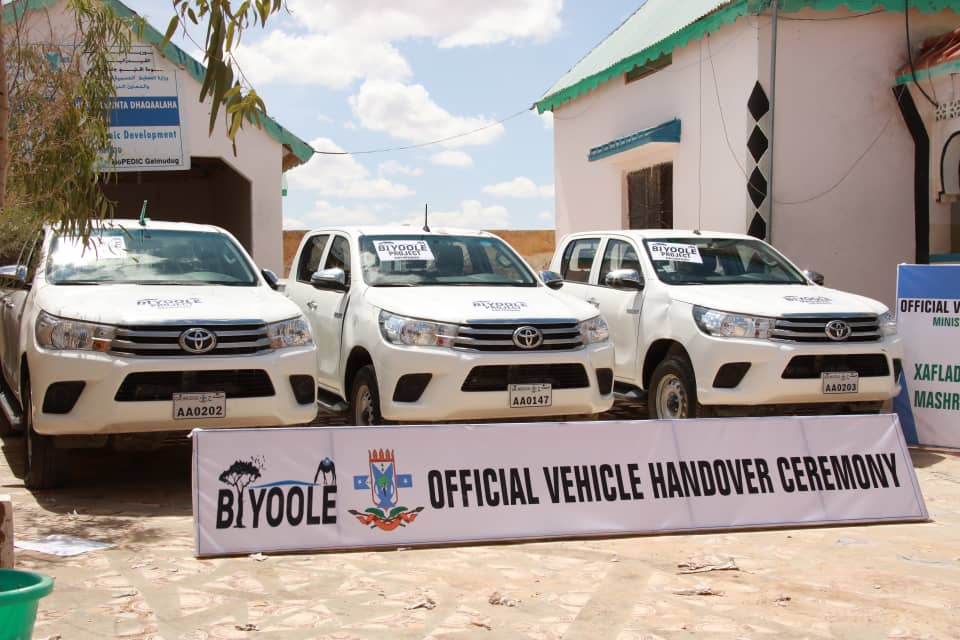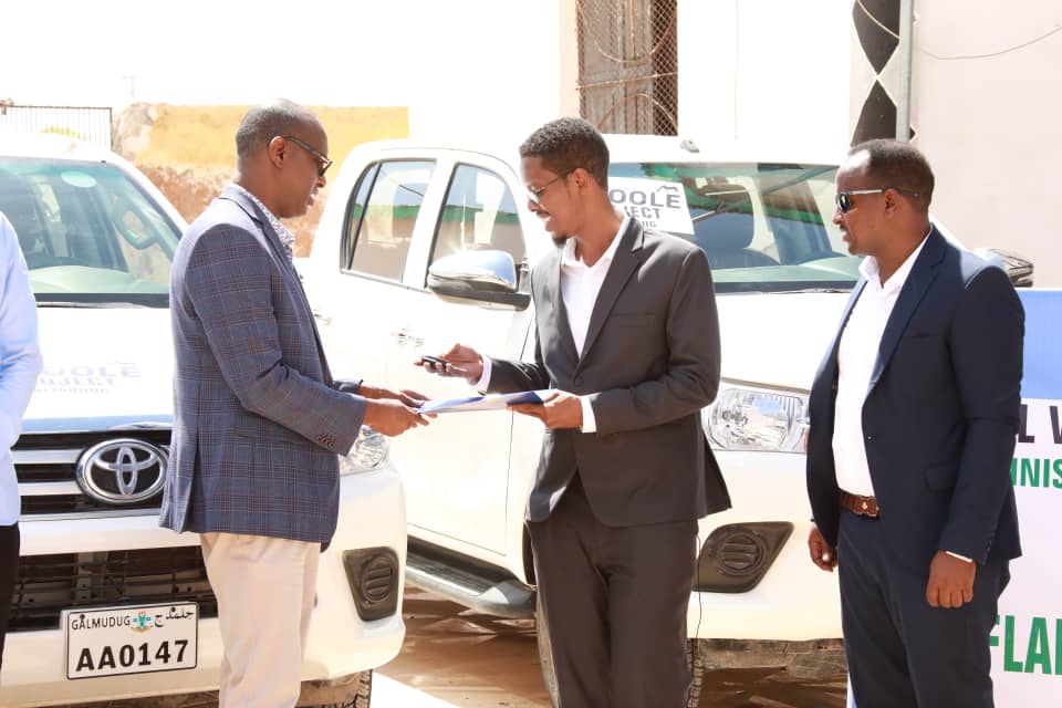 Affar gaari oo Land cruiser Helix ah ayaa maanta lagu wareejiyay wsaaradaha, Biyaha, Xanaanada Xoolaha, Qorsheynta Galmudug iyo Unuga hormuudka ka ah mashruuca horumarinta biyaha ee Biyoole.