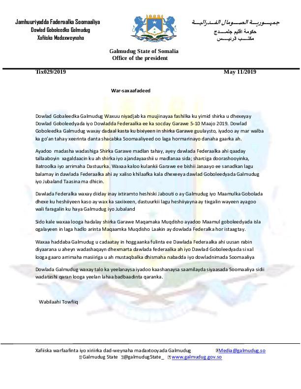 Maamulka Galmudug oo ku dhawaaqday inuu fashilmay Shirkii Garowe (War Saxaafadeed)