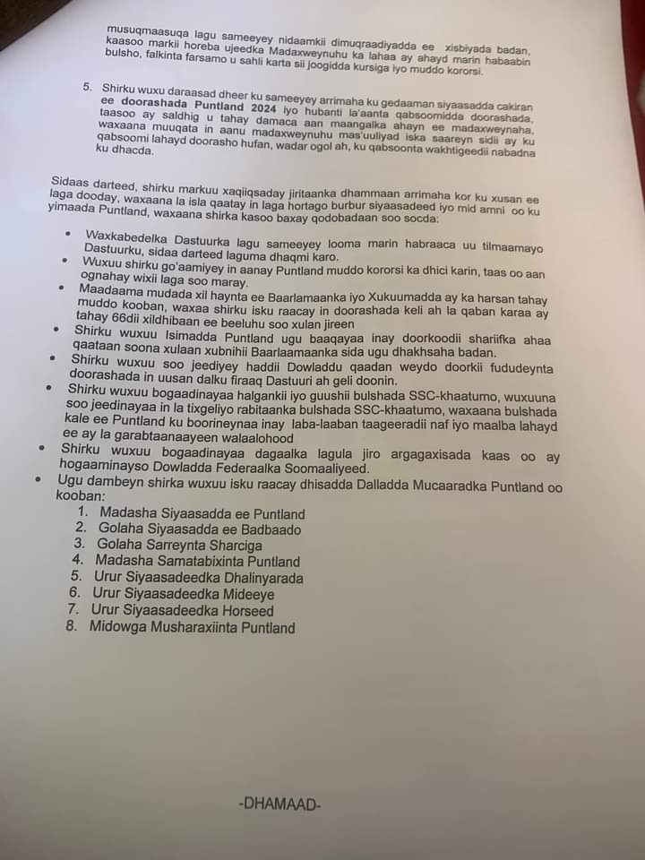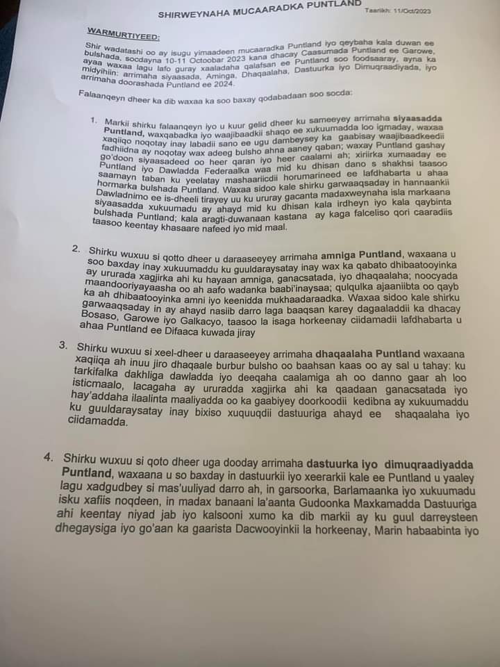 Shirkii mucaaradka Puntland oo warmurtiyeed laga soo saaray “Shirku Wuxuu isku raacay dhismaha daladda mucaaradka Puntland,”