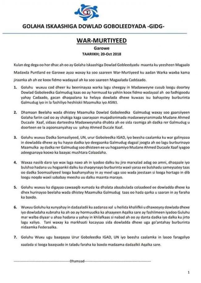 Madaxweyne yaasha Puntland ,Galmudug , Koonfur galbeed , iyo Jubaland ayaa qaadacay doorashadii shalay ka dhacday Cadaado oo lagu gudoortay Axmed Maxamed Baasto .