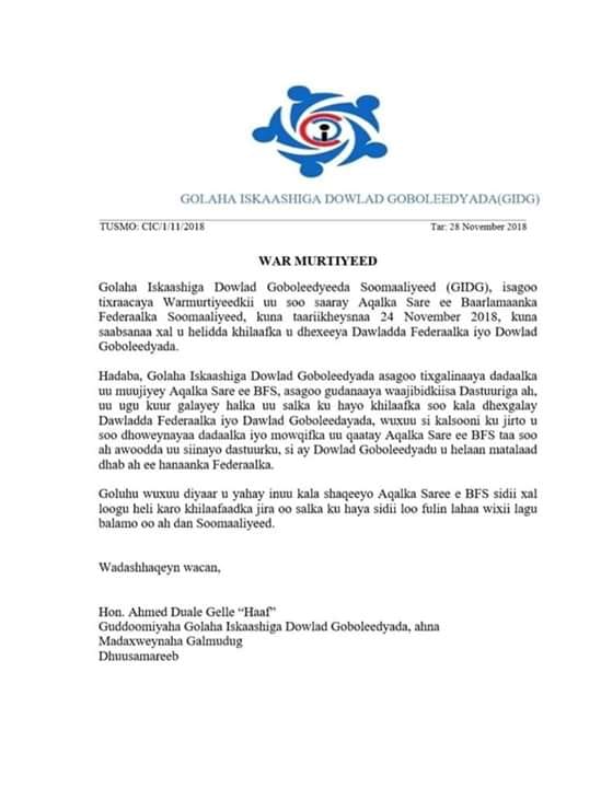 Golaha sikaashiga dowladd goboleedyada dalka oo ay haatan ku midaysan yihiin ilaa iyo sadax maamul goboleed oo kala ah ,Puntland, Galmudug, iyo Jubaland,  ayaa waxa ay soo dhaweeyeen go,aankii shalay ka soo baxay aqalka sare ee Soomaaliya oo lagu xaliyay khilaafkii soo jeetamayay mudada dheer ee udhexeeyay dowladda iyo maamul goboleedyada.
