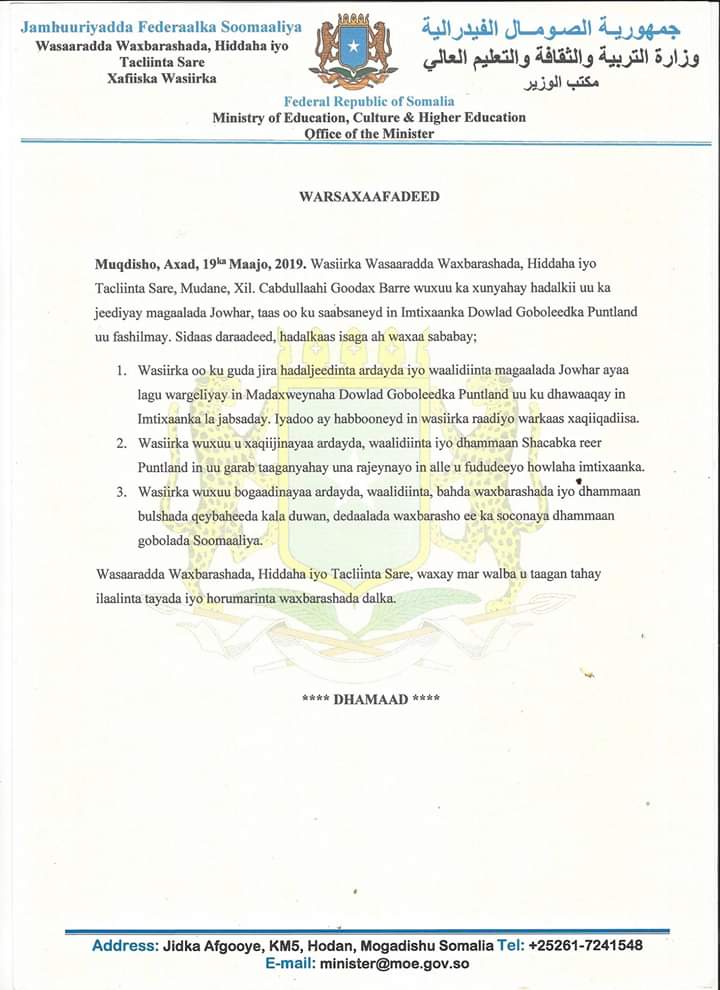 Wasiirka Waxbarashada Soomaaliya Goodax Barre oo goordhow soo saaray War Saxaafadeed ayaa sheegay inuu ka xunyahay hadal shalay uu ka jeediyay magaalada Jowhar, oo ahaa inuu fashilmay imtixaanka maamulka Puntland.
