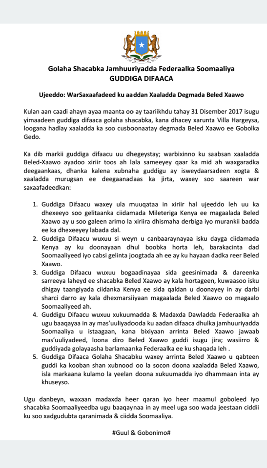 War-saxaafadeed ay soo saareen Guddiga difaaca Baarlamaanka Soomaaliya ayey ka soo saareen dhowr Qodob oo ay kaga hadlayeen faragelinta Kenya ay ka wadaan dhulka Koofureed gaar ahaan degmada Baladxaawo ee Gobolka Gedo.