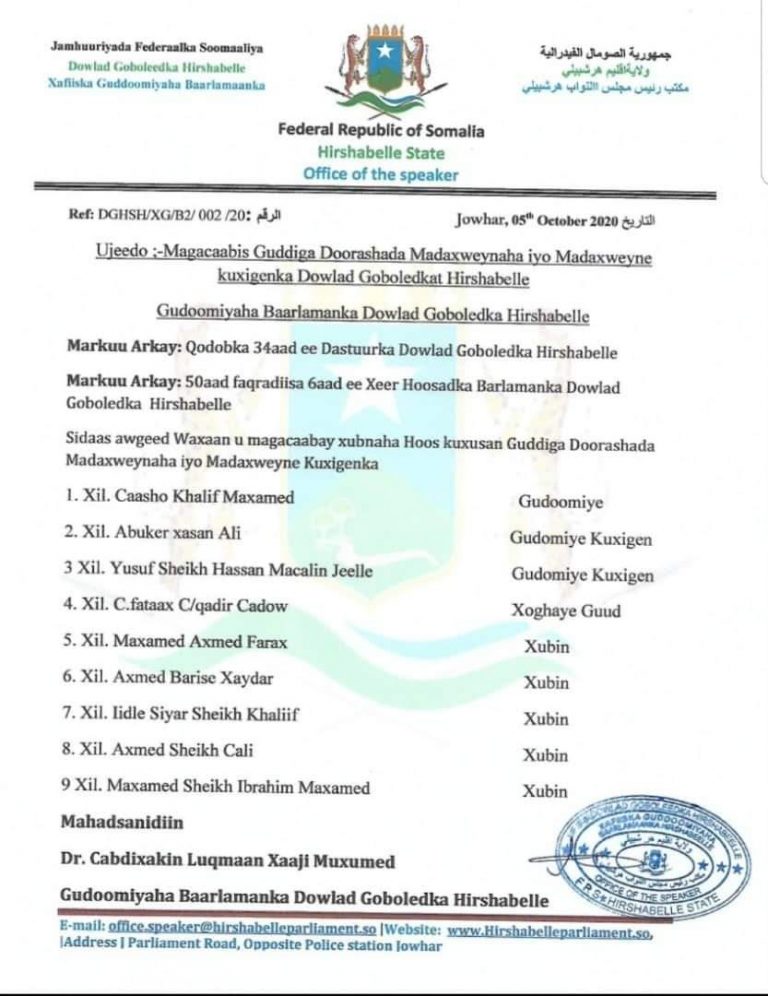 Guddoomiyaha Baarlamaanka 2aad ee dowlad goboleedka Hirshabelle Cabdixakiin Luqmaan ayaa magacaabay guddiga doorashada Madaxweynaha iyo Madaxweyne ku xigeenka dowlad goboleedka Hirshabelle.