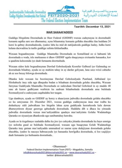 Ugu dambeyn Guddiga ayaa sheegay in, ayada oo horey u shaaciyeen jadwalka doorashada golaha shacabka oo ku asteysanaa 24- Disember 2021, ay caddeynayaan inay mar walba ku dedaaleen sidii jadwalkaas loo hirgalin lahaa ayna guddiyada heerarkooda kala duwan dhameystireen diyaar garawga qabashada doorashada, balse dib u dhaca ku yimaada jadwalka doorashada ay mas’uuliyaddiisa qaadayaan mas’uuliyiinta Golaha Wadatashiga Qaranka oo siyaasiyan dhankooda uga xanibantahay hawshu.