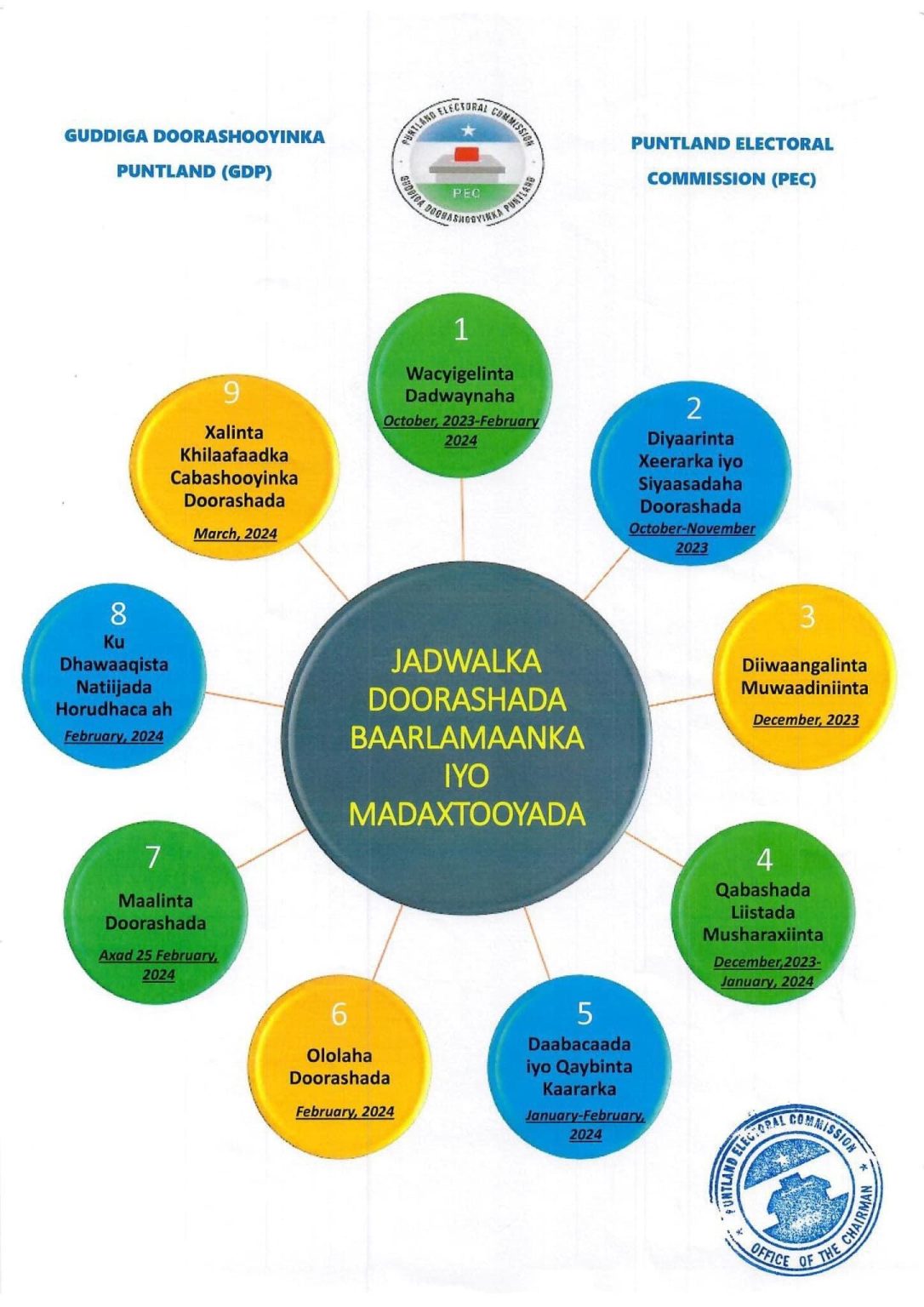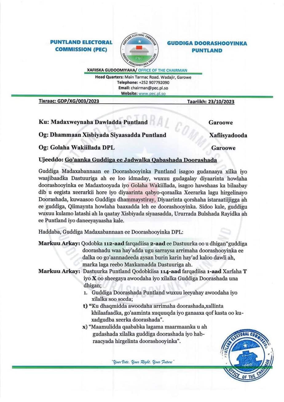 Guddiga doorashooyinka Puntland ee PEC ayaa ku dhawaaqay doorasho qof iyo cod ay soo doorayaan madaxweynaha iyo golaha wakiilada 25 Febaraayo 2024.