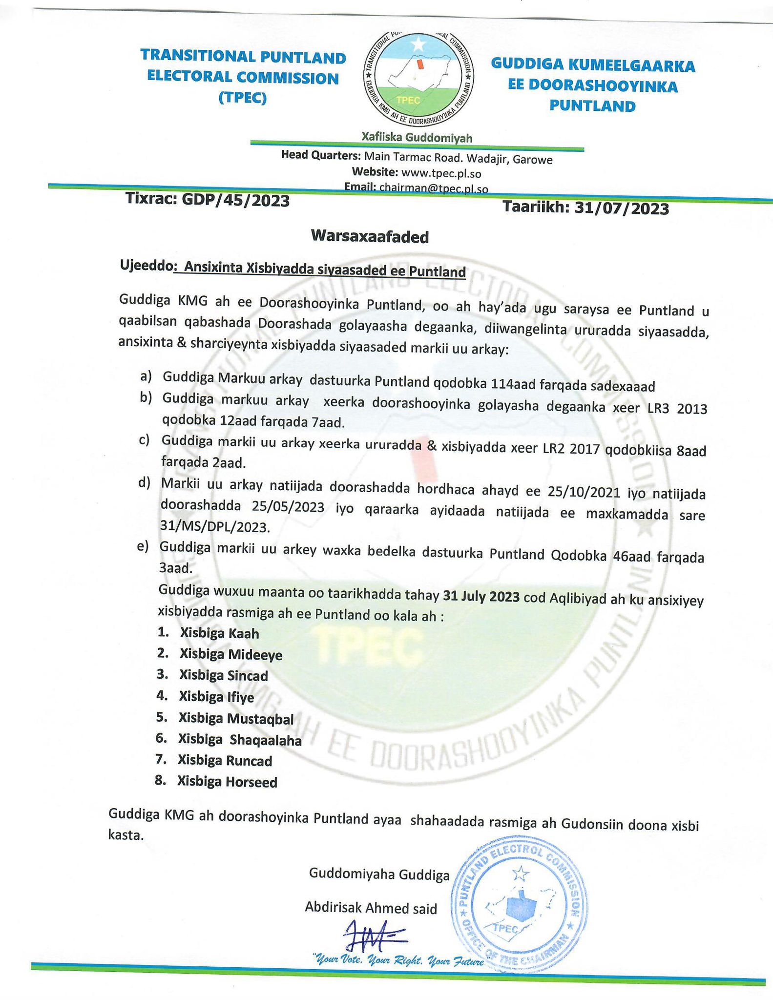 Guddiga KMG ah ee doorashooyinka Puntland ayaa shaaciyey 8-da xisbi ee rasmiga ah oo Puntland yeelatay, Puntland ayaa u guurtey nidaamka xisbiyada badan iyadoo dadweynuhu toos u dooran doonaan Madaxweynaha, Kuxigeenka iyo Golaha Wakiilada.