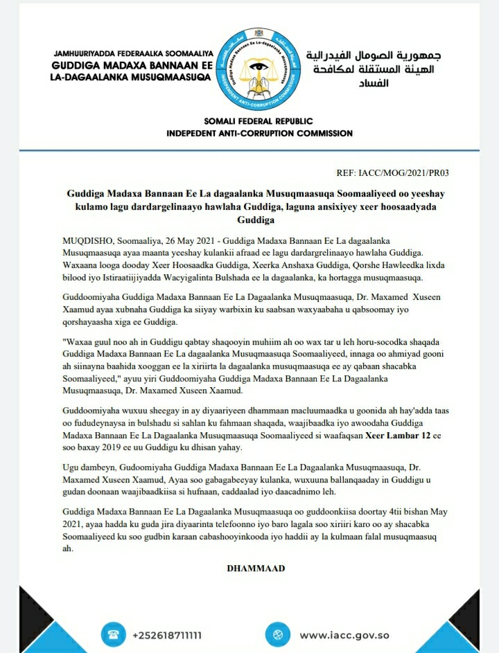 Guddiga madaxa banaan ee la dagaalanka Musuq maasuqa oo soo saaray Warsaxaafadeed (Akhriso)
