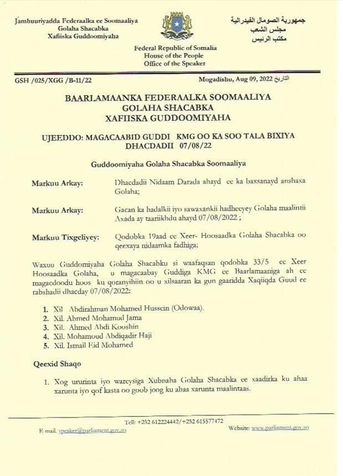 Qoraal kasoo baxay Xafiiska Guddoomiyaha Golaha Shacabka Sheekh Aadan Maxamed Nuur (Madoobe) ayaa lagu Magacaabay Guddi ka kooban 5 Xubnood, waxaana laga sugayaa shaqooyinka kala ah.
