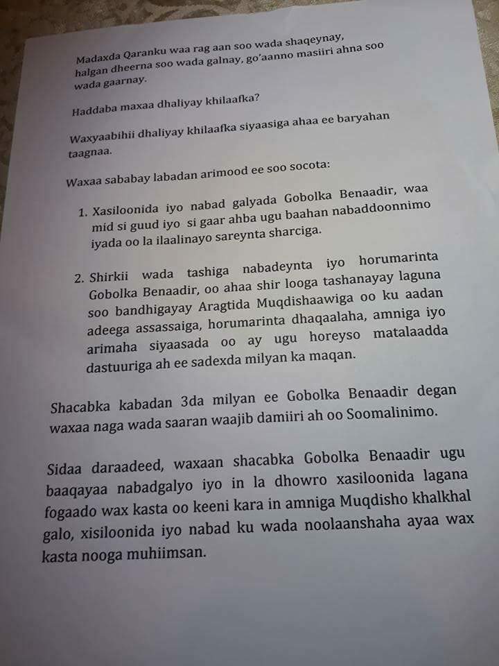 Wuxuu sheegay khilaafka beryahan taagnaa inuu ka dhashay laba arrimood oo kala ah xasiloonida iyo nabadgelyada Gobolka Banaadir iyo shirka wadatashiga Nabadeynta iyo horumarinta gobolka Banaadir oo looga hadli lahaa maqaamka Muqdisho.