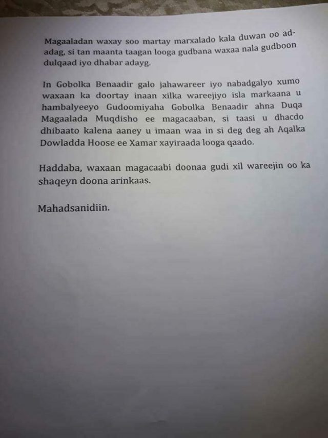 Thaabit Cabdi Maxamed Gudoomiyihii hore ee Gobolka Banaadir ahaana Duqii Muqdisho ayaa caawa ka hadlay xilka qaadistii lagu sameeyay, kadib hadal uu siiyay warbaahinta qeybaheeda kala duwan.
