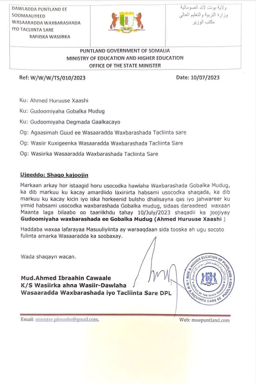 Wasaarada Waxbarashada Puntland oo shaqo joojin ku sameysay Gudoonka Waxbarashada Gobalka Mudug, Axmed Huruuse Xaashi.