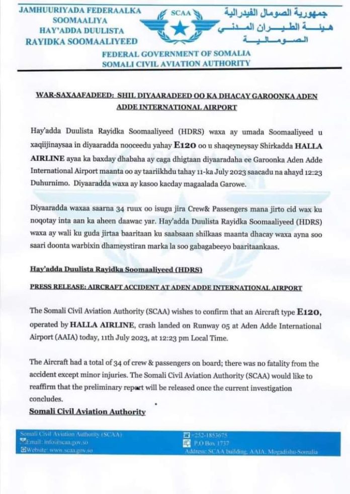 Hay’adda duulista rayidka ah oo war ka soo saartay diyaaraddii ku dhacday garoonka Muqdisho.
