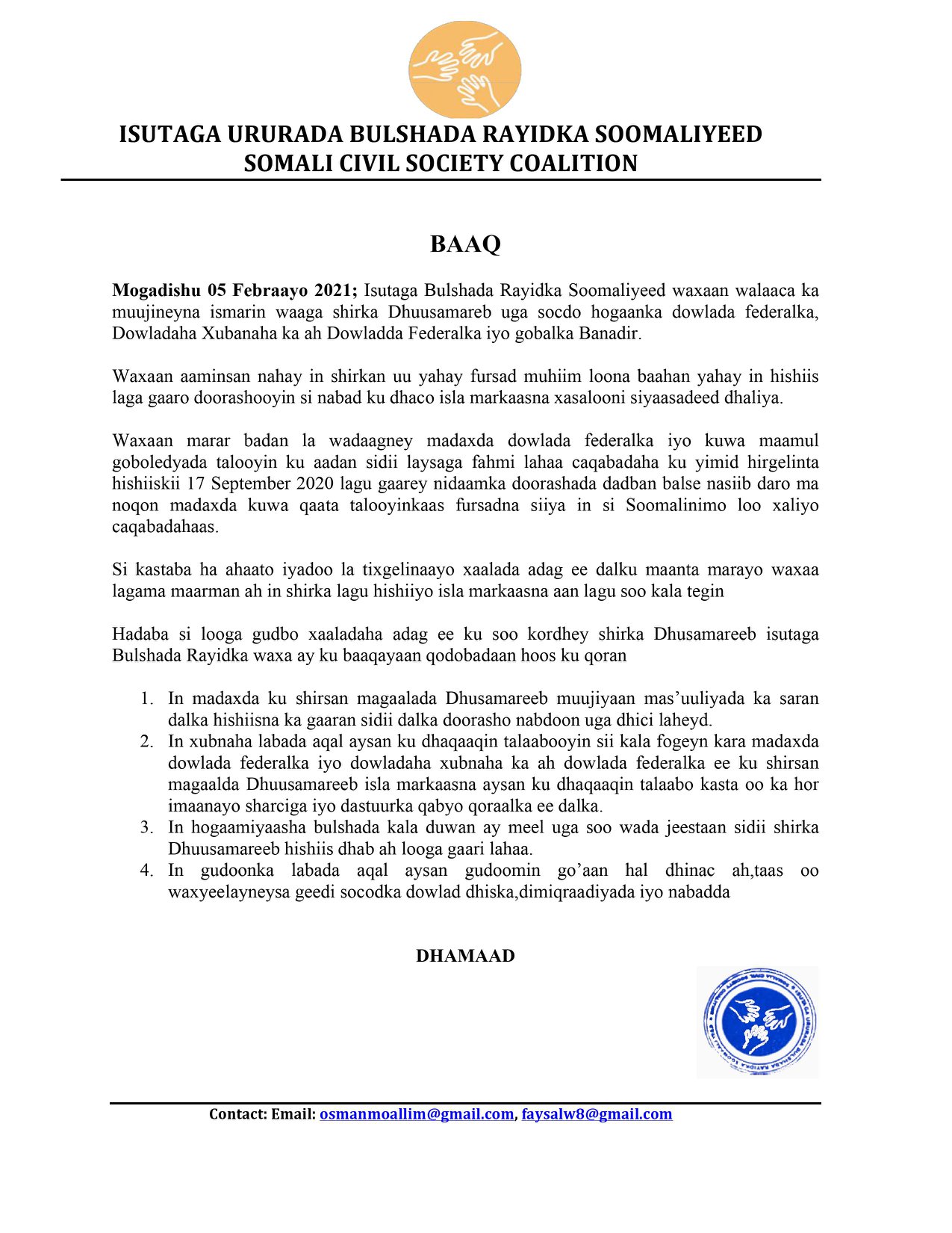 Mogadishu 05 Febraayo 2021; Isutaga Bulshada Rayidka Soomaliyeed waxaan walaaca ka muujineyna ismarin waaga shirka Dhuusamareb uga socdo hogaanka dowlada federalka, Dowladaha Xubanaha ka ah Dowladda Federalka iyo gobalka Banadir.