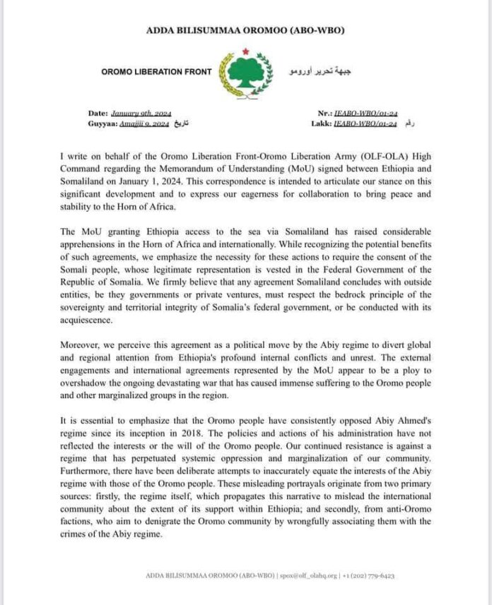 Sidoo kale Jabhadda xoreynta Oromada ee dalka Itoobiya ee loo soo gaabiyo OLF ayaa sheegtay in ay si buuxda u ixtiraamayso madax bannaanida dhuleed ee Soomaaliya.