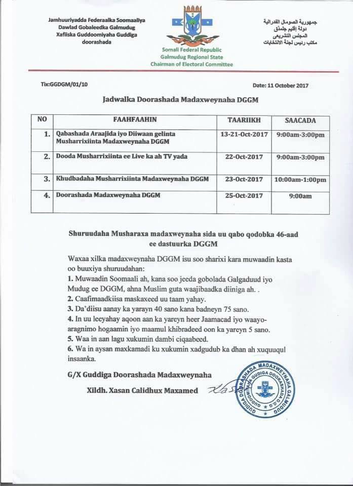 Guddiga doorashada Madaxweynaha Galmudug oo ay dhawaan Magacaabeen Xildhibanadii sheegay in ay xilkii k qaadeen Axmed Ducaale Geelle xaaf ayaa Maanta soo saaray Jadwalka doorashada Madaxweynaha Galmudug.