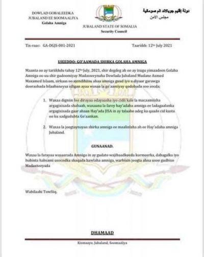 Dowlad Gobaleedka Jubbaland ayaa digniin adag kasoo saartay la Macaamilka Argagixisada Al Shabab, Digniinta ayaa si gaar ah u quseysa odayaasha dhaqanka oo la faray in aysan wax wada shaqeyn ah la yeelan karin Al-Shabaab xilli loo diyaar garoobayo Doorashooyinka Dalka.