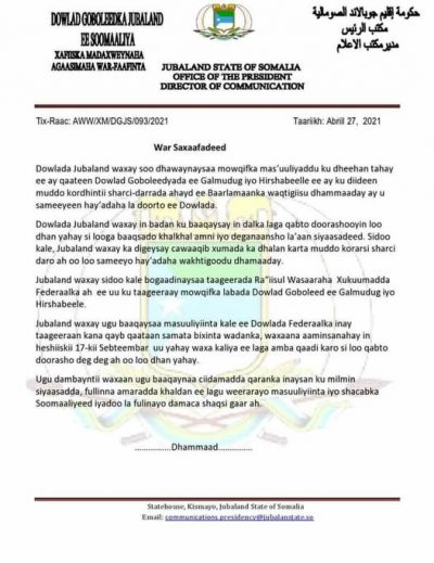 Dowlad goboleedka Jubbaland ayaa soo dhawaysay War-murtiyeedkii ay soo saareen Dowlad goboleedyada Galmudug iyo Hirshabeele.
