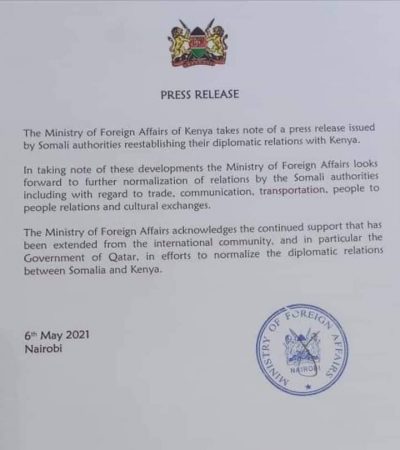Wasaaradda Arrimaha Dibadda Kenya ayaa war qoraal ah oo ay ka soo saartay xiriirka diblumaasiyadeed ee labada dal ayaa sheegtay in ay soodhaweynayso soocelinta xiriirka labada dal, una mahadcelisay doorka dowladda Qadar.