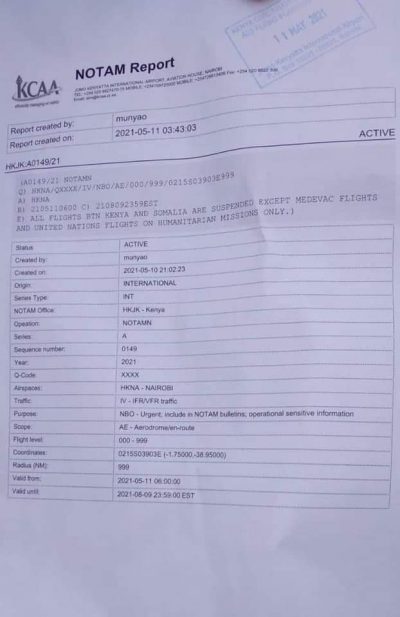 Qoraal ka soo baxay agaasimaha duulimaadyada rayidka ee dalka Kenya Gilbert Kibe ayaa lagu sheegay in amarkan uu soconayo illaa iyo 9ka bisha August ee sanadkan.