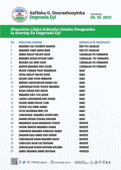 Liiska Xubnaha Golaha deegaanka ee degmada Eyl kusoo baxay.