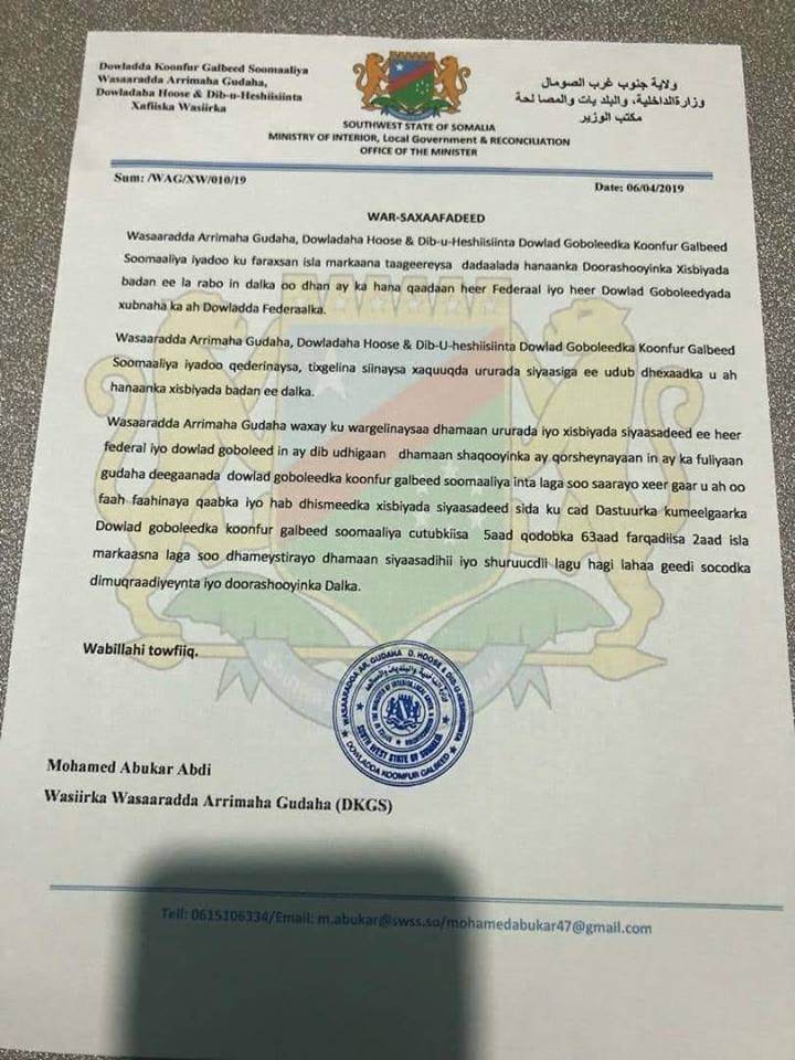 Sidoo kale Wasaaradda Arimaha Gudah Koonfur Galbeed ayaa ku wargelisay dhammaan Ururada iyo xisbiyada siyaasadeed ee heer federal iyo dowlad Goboleed in ay dib u dhigaan shaqooyinkii ugu qorsheysnaa inay ka qabtaan deegaanada Koonfur Galbeed.