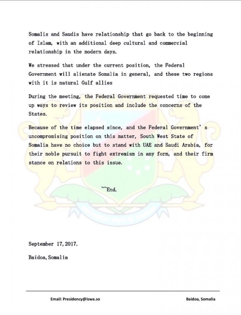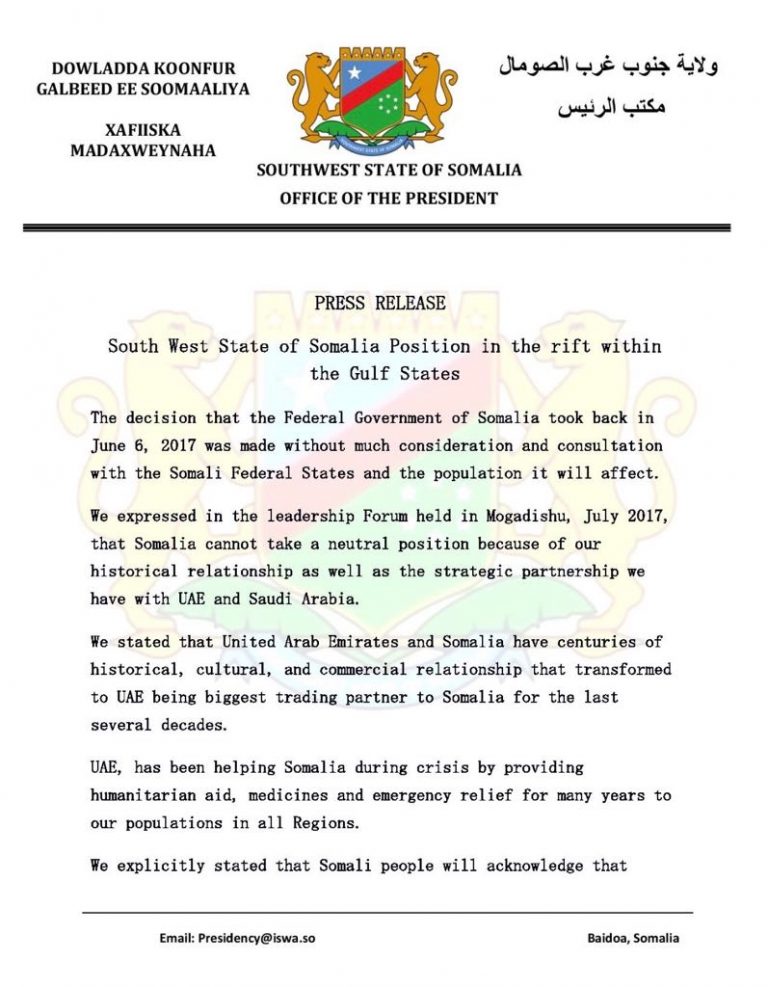 Maamulka Koonfur Galbeed Soomaaliya ayaa taageeray isbahaysiga Sacuudi Carabiya khilaafka ka dhaxeeya wadamada Khaliijka iyo dowladda Qadar.