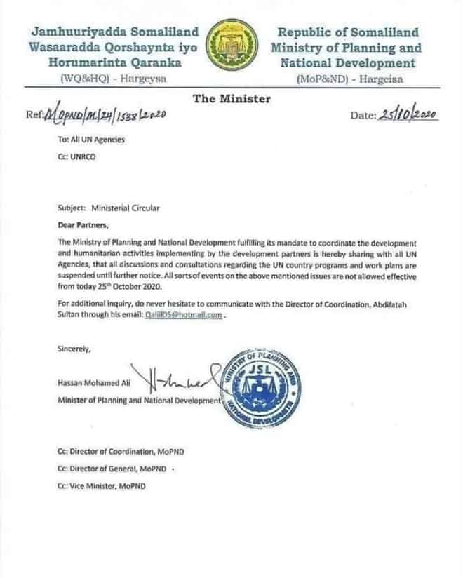 Qoraal kasoo baxay Wasaaradda Qorshaynta & Horumarinta Somaliland ayaa waxaa lagu sheegay in la hakiyay wada-shaqeyntii ka dhaxeysay Soomaaliland iyo Hay’adaha Qaramada Midoobay.