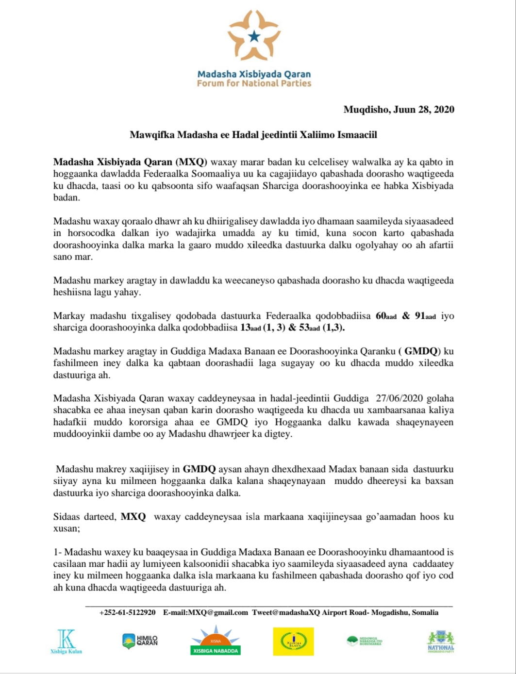 War saxaafadeedka Madasha ayaa loogu baaqay Guddiga Madaxa bannaan ee doorashooyinka Qaran inay is casilaan, ayna aheyn dhex dhexaad madaxa bannaan sida Dastuurki siiyay, kuna milmeen hoggaanka dalka, kana shaqeynayaan muddo kororsi GMDQ iyo Hoggaanka dalka ku wada joogaan.