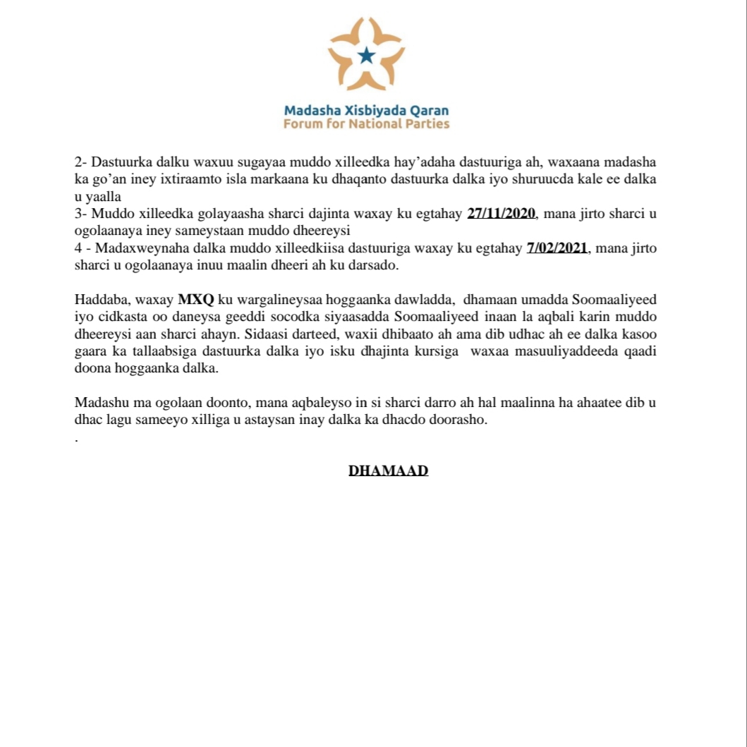 Madashu ayaa sheegay in muddo xileedka Madaxweynaha uu ku egyahay 7 bisha Febraayo 2021, sidoo kale muddo xileedka Golayaasha sharci dejinta uu ku egyahay 27 November 2020, sidaas darteed ma jirto sharci u ogolaanaya inay mudada kororsadaan, kuna darsado maalin dheeri ah.