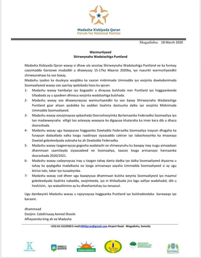 Madasha Xisbiyada Qaran ayaa soo dhoweysey Shirweynaha Wadatashiga Puntland ee ka qabsoomey caasimadda Garoowe mudaddii u dhaxeysay 15-17ka Maarso 2020ka, iyo nuxurkii warmurtiyeedkii shirweynahaas ka soo baxay.